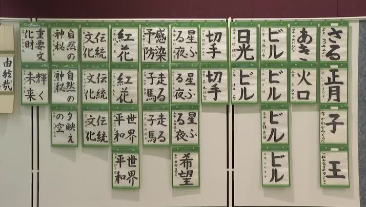 堀谷春水書道会に通う 生徒の書道作品が並ぶ