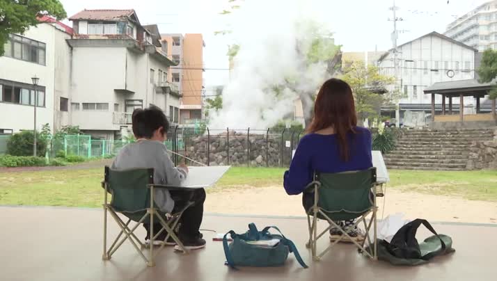 別府八湯の一つ鉄輪温泉の町並みをモチーフに絵を描く