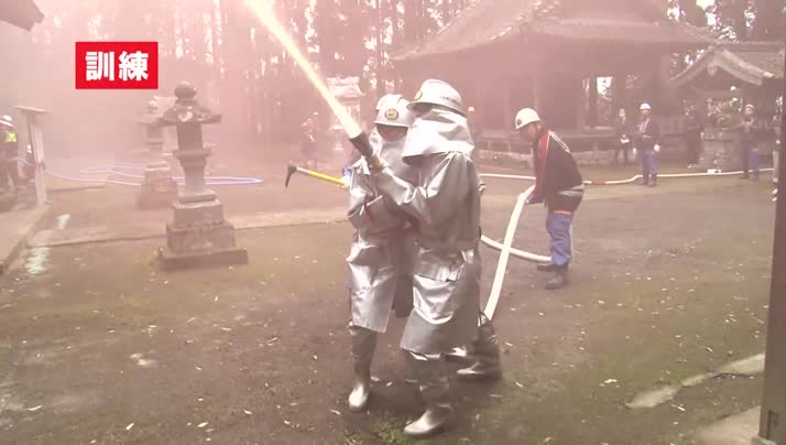 防火訓練は、神社の本殿近くから火災が起きたとの想定です。