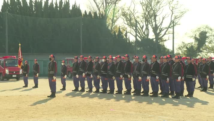 日出町消防団秋季訓練は1月に行われる「日出町消防団特別点検」の