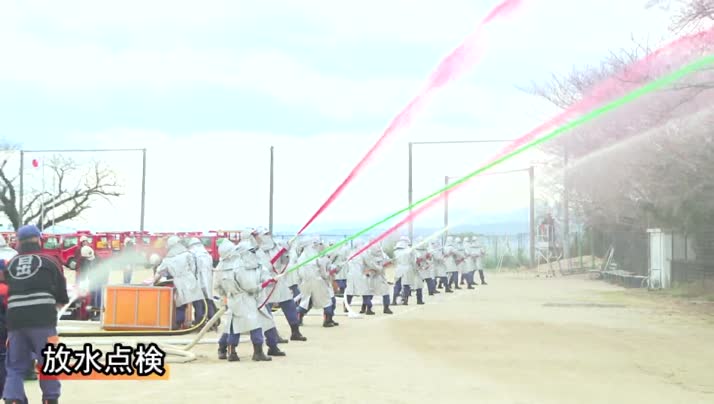 消火用ポンプを使って色水を放水し、消防団の年始めの活動に花を添えました。