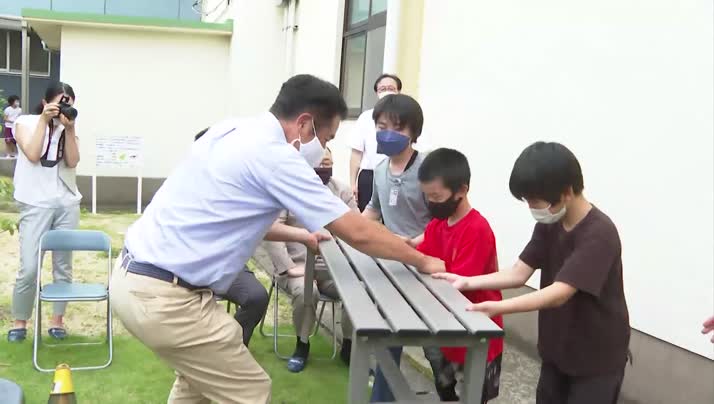 朝日小学校にベンチを寄贈したのは別府ロータリークラブで