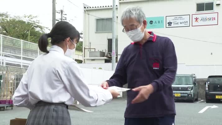 2か所ある出入口に分かれて配布活動をした生徒たちは