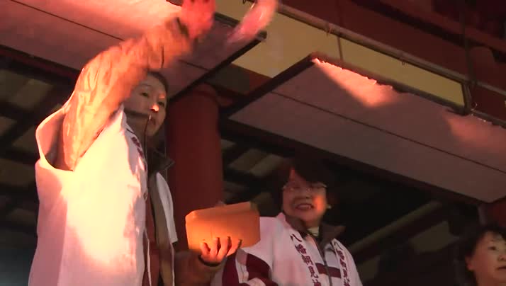 年男、年女、厄年の人を対象に1年の幸福を願う豆まきが行われました。