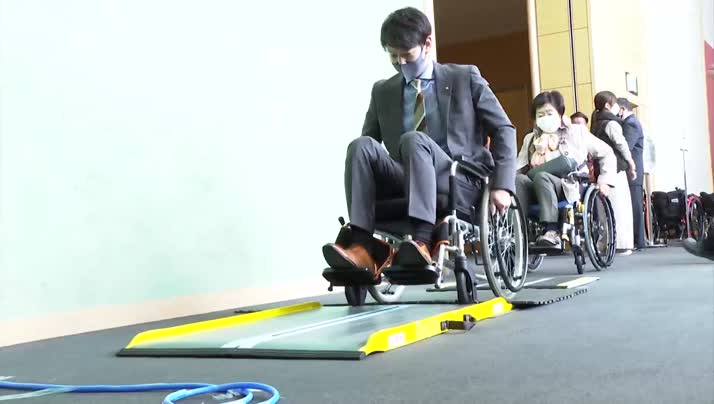 車いすに乗車し、段差のあるテストコースを体験しました。