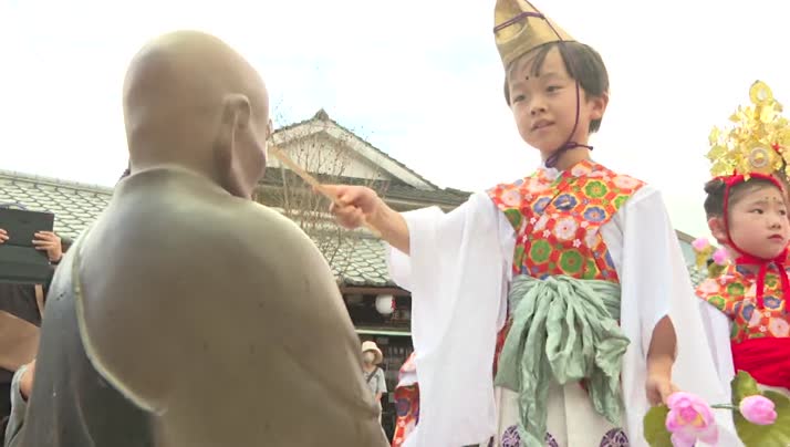 「お稚児さん」が無病息災を願って順番に一遍上人像に