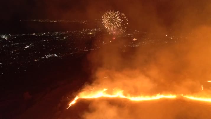 温泉まつり初日に八幡朝見神社で熾された御神火を山頂付近に点火。