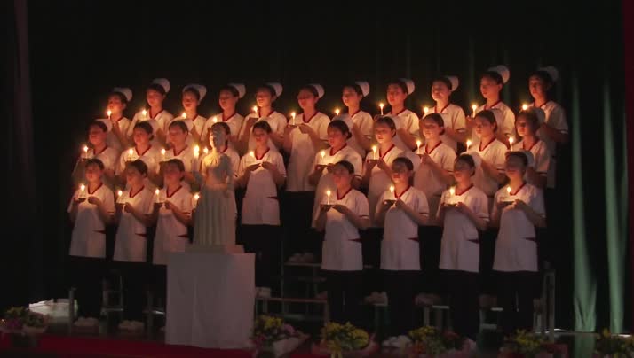 ろうそくの火を受け取った後、看護師としての心構えを誓う