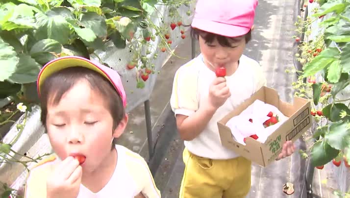 イチゴ狩りでは、箱が配られ、子どもたちは食べきれない分のいちごを