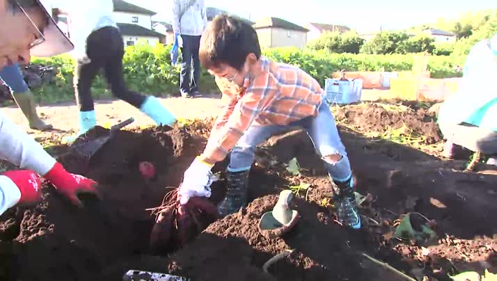 芋掘りでは、老人会の会員が大きなショベルや鍬で