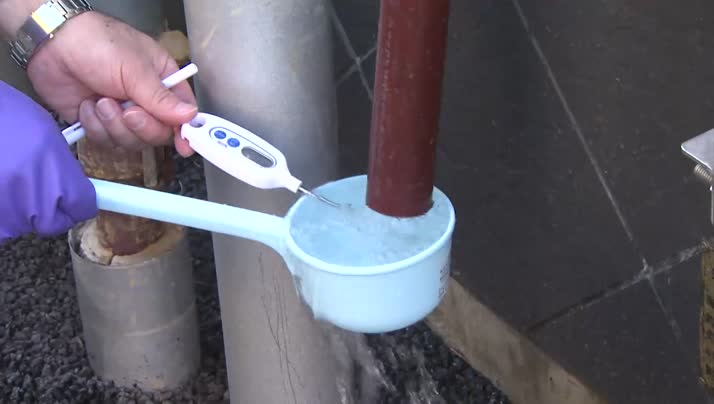 現地調査では、泉源や、泉源から一番近い湯口で温泉の温度を計り、