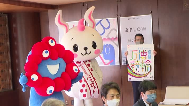 「ミャクミャク」、別府市宣伝部長の「べっぴょん」が訪れました。