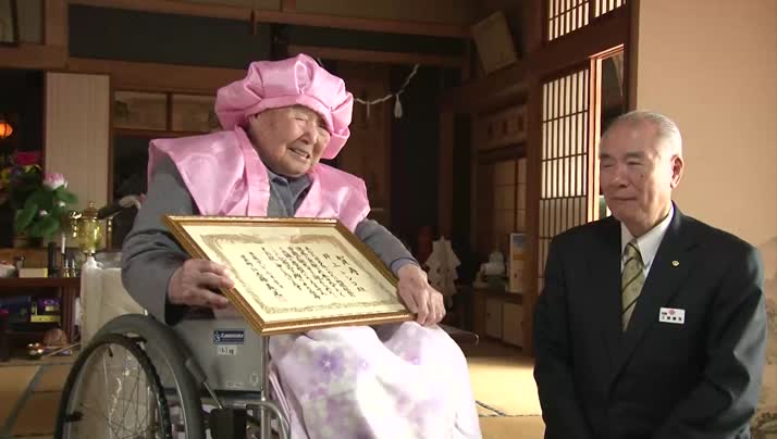表彰状とお祝いの品を贈り、長寿を祝いました。