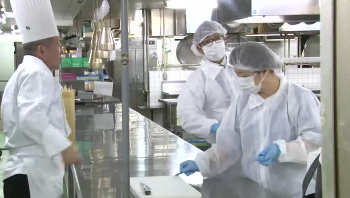 レストランの厨房での検査では監視員が白衣を身に着け、
