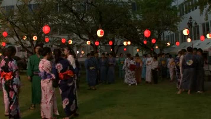 盆踊りが始まると地域の人達の後ろに留学生が並び