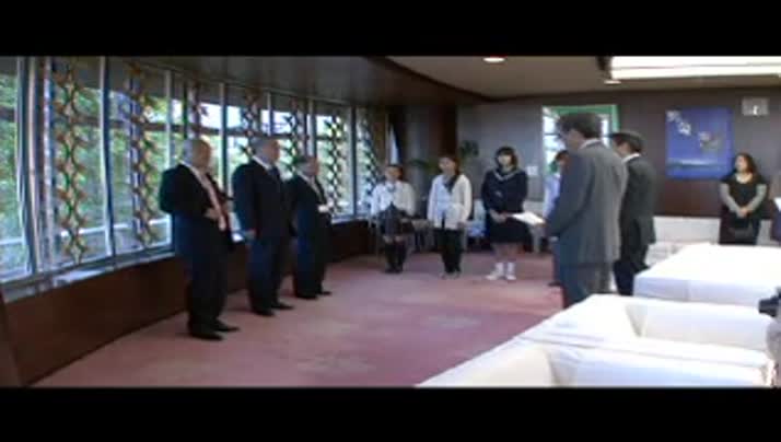 浜田市長と、教育課長の『ゴウジ ヨシアキ』さんが、1人ひとりに表彰状と記念品を贈りました。