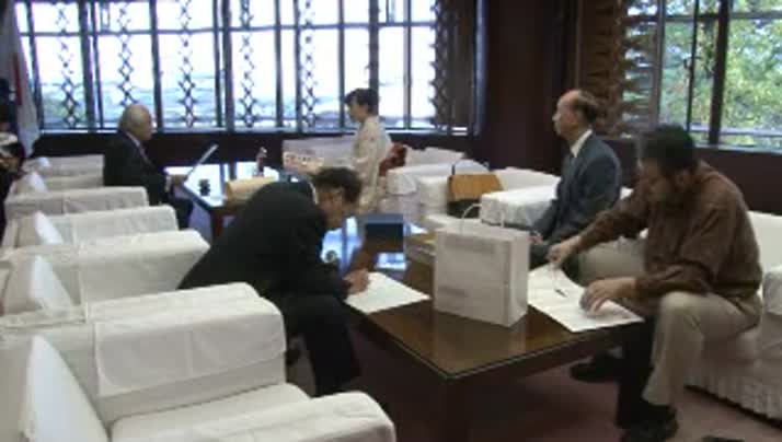 「文部科学大臣賞」の盾や賞状を手に市役所を訪れ