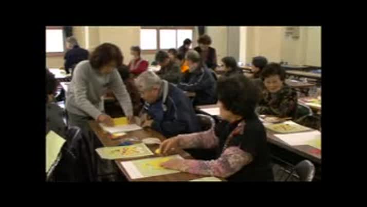 この日は57人が参加。ちぎり絵教室の講師を務める大津洵子さんが、完成した作品を見せながら作り方を説明しました。