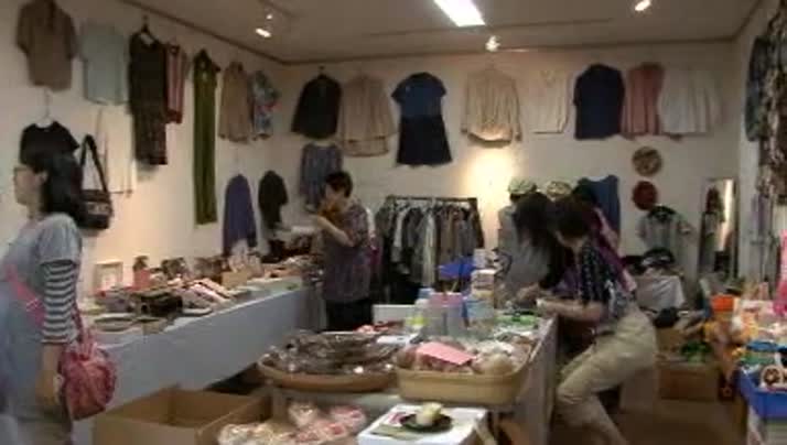 多くの民芸品や雑貨チャリティーに賛同した市民や企業から提供された野菜や衣類などが並び