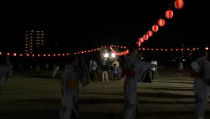 盆踊りの輪の中心で太鼓を力強くたたきました。