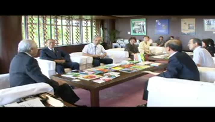 この日プレゼントを手に別府市役所を訪れたのは、チャーチル会の塩月さんをはじめ4人です。
